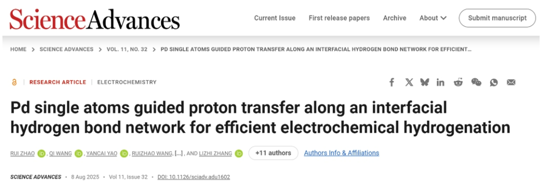 環(huán)院智慧|張禮知團隊在Sci. Adv. 發(fā)文報道鈀單原子誘導界面氫鍵網(wǎng)絡質(zhì)子轉(zhuǎn)移及其高效電化學加氫