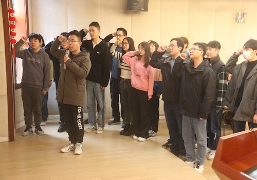 近期入黨的預(yù)備黨員在本科生黨支部書記宋宇軒的帶領(lǐng)下面向黨旗莊嚴(yán)宣誓。