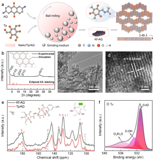 以2,6-二氨基蒽醌(AQ)和2,4,6-三甲酰基間苯三酚(Tp)為聚合單體,醋酸鈉為催化劑,采用機(jī)械化學(xué)法合成了Kf-AQ。該催化劑具有良好的結(jié)晶性,且13C核磁譜和XPS O1s數(shù)據(jù)證明了層狀結(jié)構(gòu)酮式蒽醌共價有機(jī)框架的成功合成(圖1)。