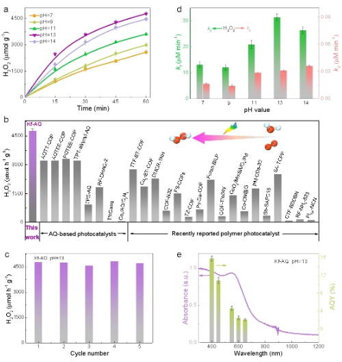 該團(tuán)隊(duì)利用機(jī)械化學(xué)法合成了一種酮式蒽醌共價有機(jī)框架材料(Kf-AQ),發(fā)現(xiàn)該材料能夠利用分子氧和堿性水(pH=13)直接合成H2O2,可見光照射(λ > 400 nm)下其雙氧水產(chǎn)率可達(dá)4784 μmol h-1 g-1,在400 nm表觀量子產(chǎn)率為15.8%。系統(tǒng)表征和理論計(jì)算表明,酮式蒽醌結(jié)構(gòu)增強(qiáng)了水團(tuán)簇的吸附并弱化了端羥基O-H鍵,堿性條件下氫氧根的過剩電子削弱了水分子的氫鍵網(wǎng)絡(luò),從而降低了從H2O中提取氫的能壘,有效提升了該材料光合成H2O2催化活性。本研究提供了一種新型高效的光催化合成H2O2材料,并闡明了H2O中高效提取氫對光合成H2O2的重要意義。