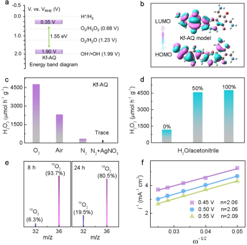 在可見光(λ > 400 nm)照射下,Kf-AQ具有良好的催化活性和穩(wěn)定性,在pH=13時H2O2產(chǎn)率最高可達(dá)4784 μmol h-1 g-1,高于目前報(bào)道的蒽醌聚合物以及其它共價有機(jī)框架材料(圖2)。同位素分析和不同氣氛條件的性能測試證實(shí)雙氧水中的氧來源于氧氣,氫來源于水(圖3)。