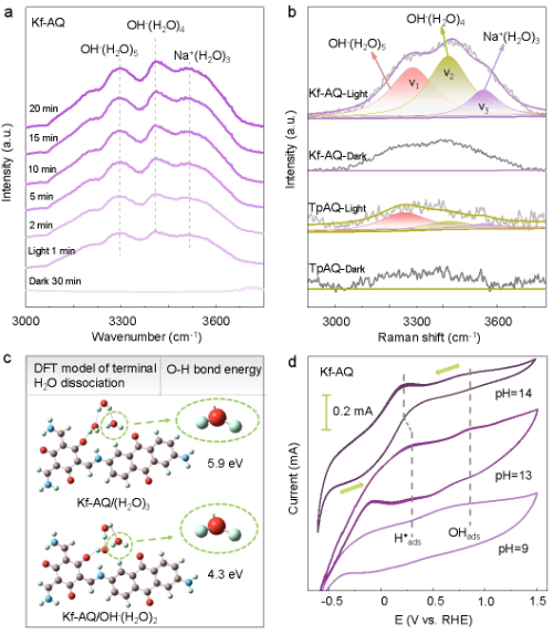 當(dāng)pH=13時,Kf-AQ表面吸附了不同結(jié)構(gòu)的水團(tuán)簇(OH-(H2O)n)。酮式結(jié)構(gòu)有助于水團(tuán)簇的吸附,OH-離解結(jié)構(gòu)進(jìn)一步降低水分子摘?dú)?/span>能壘,加速水中摘氫和雙氧水合成。Kf-AQ的CV曲線顯示水解離形成活性氫,進(jìn)一步確認(rèn)酮式蒽醌結(jié)構(gòu)促進(jìn)水氧化摘?dú)?/span>。