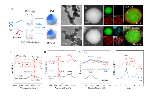 本研究利用液相修飾的方法制備了Si-nZVI。多種電鏡、光譜及同步輻射表征證明,硅酸根以硅酸單體的形式修飾在零價鐵表面。