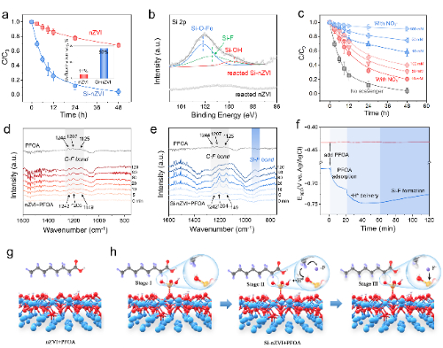 以全氟辛酸(PFOA)為目標(biāo)污染物,該團隊評價了Si-nZVI在氬氣氛圍下的脫氟性能。Si-nZVI能在48h內(nèi)去除96%的PFOA,且脫氟率高達92%,而nZVI僅能去除34%的PFOA,脫氟率為11%。反應(yīng)后樣品表征結(jié)果顯示,F(xiàn)以Si-F鍵的形式存在于Si-nZVI表面,說明Si-nZVI在實現(xiàn)脫氟的同時,也實現(xiàn)了F的固定,降低了F二次污染風(fēng)險。利用原位紅外耦合電化學(xué)開路電位的方法監(jiān)測了脫氟反應(yīng)過程,nZVI/PFOA反應(yīng)中紅外光譜與開路電位均無明顯變化,說明nZVI與PFOA無明顯電子轉(zhuǎn)移過程;Si-nZVI/PFOA反應(yīng)中,原位紅外光譜與開路電位均出現(xiàn)了明顯的三個階段,可對應(yīng)Si-nZVI去除PFOA的三個階段:(1)Si-nZVI對PFOA的吸附,(2)Si-nZVI對PFOA的加氫脫氟,(3)Si-F鍵的形成。