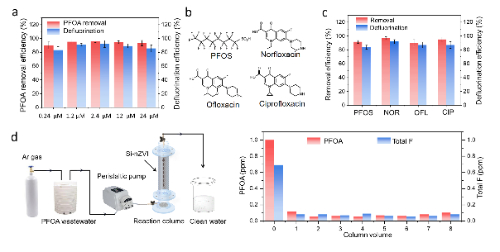 該團隊還設(shè)計了填充有Si-nZVI的柱實驗反應(yīng)塔去除不同濃度的PFOA。結(jié)果顯示Si-nZVI對0.24 - 24 μmol/L范圍內(nèi)的PFOA去除率達到90.1 - 96.2%,脫氟率達到75% - 92%。連續(xù)去除2.4 μmol/L PFOA模擬廢水8個柱體積,PFOA去除率均在90%以上,出水中總氟含量均低于0.1 ppm。同時該新型零價鐵對全氟辛磺酸,氟喹諾酮等其他含氟污染物均表現(xiàn)出優(yōu)異的脫氟效果。該方法為實際含氟廢水的深度處理提供了有前景的方案。