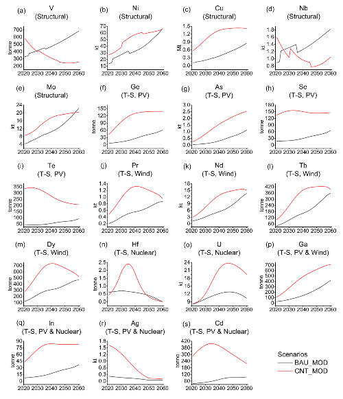 圖2 基準情景及碳中和情景下2021-2060年間的19種關鍵資源的年度需求