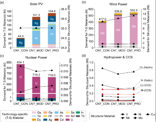 進一步考慮三種子技術(shù)市場份額調(diào)控情景,發(fā)現(xiàn)光伏發(fā)電對技術(shù)性資源的累積資源需求受子技術(shù)市場份額影響最大。相較于保守技術(shù)情景(CNT_CON),較新技術(shù)情景(CNT_MOD)和激進技術(shù)情景(CNT_PRO)下光伏發(fā)電的資源需求可增加2.2~2.5倍,主要由碲化鎘、砷化鎵等薄膜光伏組件市場份額的增加導致。風力發(fā)電對技術(shù)性資源的需求也較明顯,隨著更先進的永磁風力發(fā)電技術(shù)市場份額的增加將比保守技術(shù)情景增加約30%。核能發(fā)電對技術(shù)性資源的需求則隨第四代核反應堆技術(shù)的更多應用而出現(xiàn)下降。結(jié)構(gòu)性資源的需求受市場份額的影響相對沒那么顯著。
