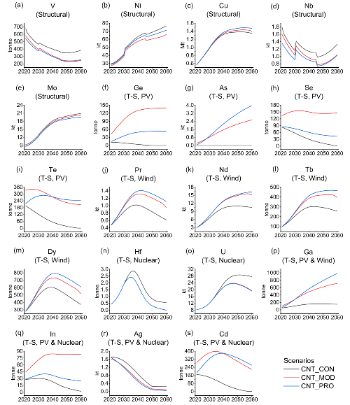 就年度需求而言,鐠(Pr)、釹(Nd)、鋱(Tb)、鏑(Dy)、鎵(Ga)等被風力發(fā)電需求的技術(shù)性資源在激進技術(shù)市場份額情景下基本一直高于其他市場份額情景。除銀(Ag)以外的所有被光伏發(fā)電需求的技術(shù)性資源在較新和激進市場份額情景下的年度需求也持續(xù)顯著高于保守情景。如鍺(Ge)、砷(As)、碲(Te)等被光伏發(fā)電需求的技術(shù)性資源年度需求隨市場份額變化最為顯著。釩(V)、鎳(Ni)、鈮(Nb)三種結(jié)構(gòu)性資源的年度需求受風力發(fā)電或水力發(fā)電資源需求的影響也有明顯變化。