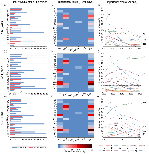 該研究主要集成宏觀經(jīng)濟模型和動態(tài)物質(zhì)流分析等方法,量化了基準情景及碳中和情景下我國發(fā)電系統(tǒng)轉(zhuǎn)型過程中光伏發(fā)電、風力發(fā)電、水力發(fā)電、核能發(fā)電以及熱電廠/碳捕集、利用與封存(CCUS)等五種主要發(fā)電技術(shù)下的22種子技術(shù)對19種礦產(chǎn)資源的需求。通過調(diào)整碳中和情景下各子技術(shù)的市場份額,揭示了低碳發(fā)電技術(shù)子技術(shù)市場份額變化對關鍵礦產(chǎn)資源需求的影響特征。最后,引入了“重要性指數(shù)”(即發(fā)電系統(tǒng)轉(zhuǎn)型過程中資源需求在各部門總需求中的占比)這一指標,并結(jié)合資源需求與儲量的比值,識別我國碳中和目標下發(fā)電系統(tǒng)轉(zhuǎn)型可能帶來約束的關鍵礦產(chǎn)資源種類。