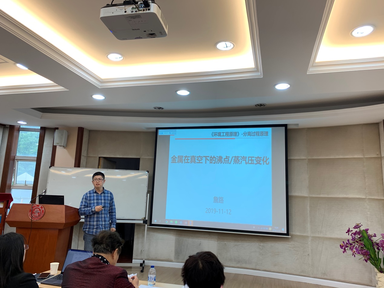 以“上好一堂課,上好一門課”為競賽理念,本次競賽由教學設(shè)計、課堂教學和教學反思三部分組成。李彭采用板書與PPT相結(jié)合的方式闡述了離心式水泵的工況點求解及其調(diào)速運行;劉婧宇以視頻作為開場,用流利的英文進行了物質(zhì)流分析;王春玲用“干將鑄劍”的故事引出上課主題,展示了固/固相反應(yīng)動力學的相關(guān)內(nèi)容;詹路則以兩個生活中常見的自然現(xiàn)象為例,一步步引導著大家學習了金屬在真空下的沸點/蒸汽壓變化;趙硯彬結(jié)合當今實時案例,講解了動物實驗和人體暴露研究的倫理規(guī)范。