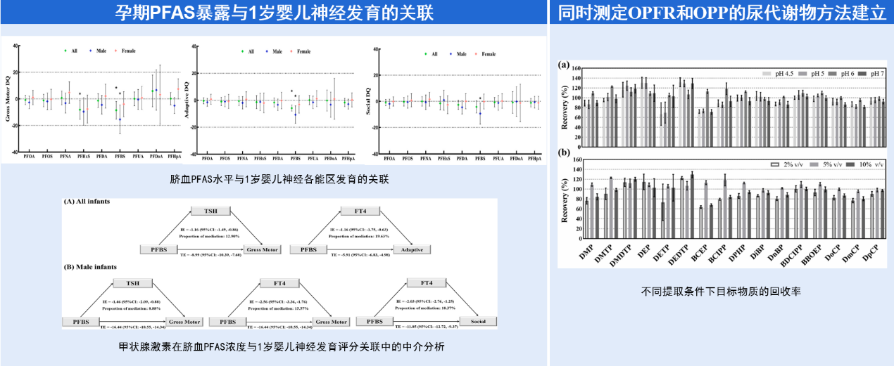 環(huán)境中新污染物對人類健康產(chǎn)生潛在不良影響,本重點實驗室建立同時測定尿液中有機磷阻燃劑和有機磷農(nóng)藥的檢測方法;評估孕期全氟化合物暴露對嬰兒神經(jīng)發(fā)育的影響及甲狀腺激素的潛在中介作用,為評價新污染物的環(huán)境健康風險提供科學依據(jù)。